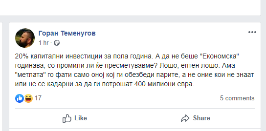 Така новинарот Теменугов на својот фејсбук профил напиша ироничен статус во кој вели дека да не беше економска годината ќе требало во промили да се пресметуваат капиталните инвестиции мислејќи на катастрофалниот процент од едвај 20% реализација на капитални трошоци за првата половина од годината.