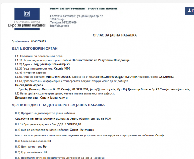 На официјалната страна на Јавни Набавки објавен е оглас од страна на Јавното Обвинителство за набавка на лимузини. Имено, во делот на    назив на договорниот орган стои Јавно Обвинителство на Република Македонија  , како  предмет на договорот за јавна набавка наведено е дека станува збор за службени патнички моторни возила за Јавно обвинителство на РСМ  додека проценетата вредност на набавката без ДДВ изнесува 3.389.830,60 или 50 илјади евра.