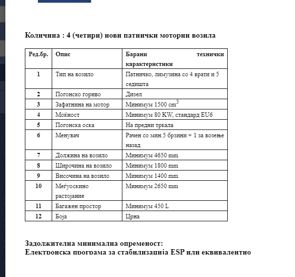 Јавното обвинителство ќе набавува четири лимузини со кои се опишани во делот на документи односно тип на возило лимузина со 4 врати и 5 седишта.