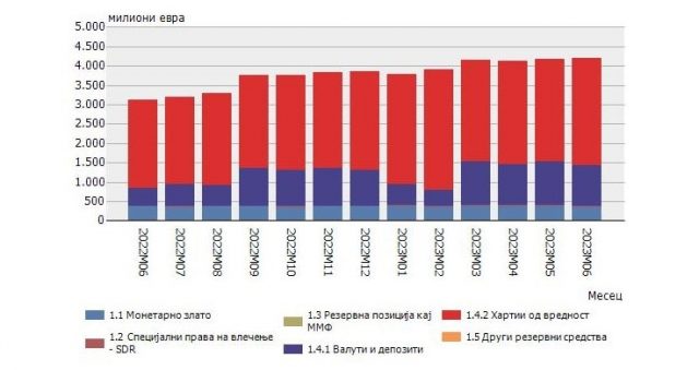 Официјалните девизни резерви за еден месец се зголемиле за 15 милиони евра. Со тоа, на крајот од прваата половина од годинава се во износ од 4.189,7 милиони евра, соопшти Народната банка.