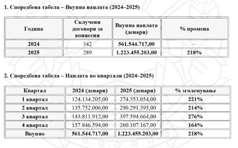 Според Министерството, во 2025 година се склучени 289 договори за концесии, при што вкупно се наплатени 1.223.455.203,00 за разлика од 2024 година кога биле склучени 342 договори, а наплатени 561.544.717,00 денери. Ова, велат од Министерството, преставува зголемување на наплатата од 218 проценти.