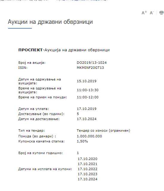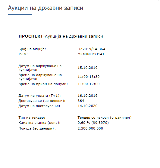 На официјалната страна на Народна банка на Република Македонија објавена е аукција од државни хартии од вредност од 3.300.000.000 денари односно 53, 6 милиони евра.